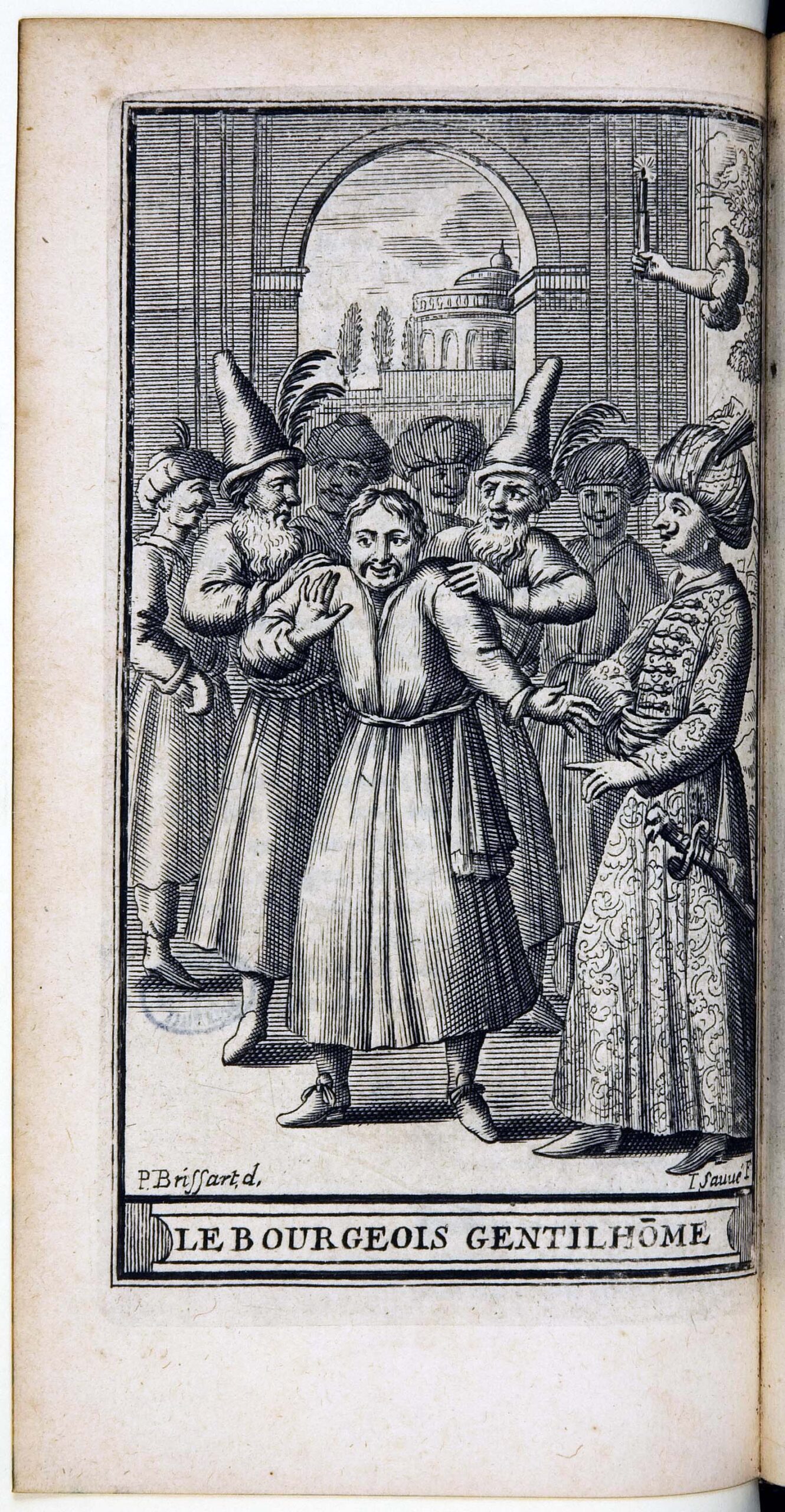 Tout fut mis en œuvre pour prolonger la présence de ce dernier : plusieurs mois durant, Soliman Aga et sa suite résident en France, débarquant à Toulon le 4 août 1669, ne quittant le territoire qu’au 22 août 16703. L’un des officiers français qui l’avait escorté ne manqua pas, à son retour, de relater au roi lors d’un repas les faits et gestes de l’envoyé. C’est alors que naît, à la demande du roi, Le Bourgeois gentilhomme : deux mois après le départ de l’émissaire, la pièce connaît sa première sur la scène française4. Pensée dès l’origine sous l’angle de la satire, elle s’incarne sous la forme d’une comédie-ballet en cinq actes, écrite en prose5.